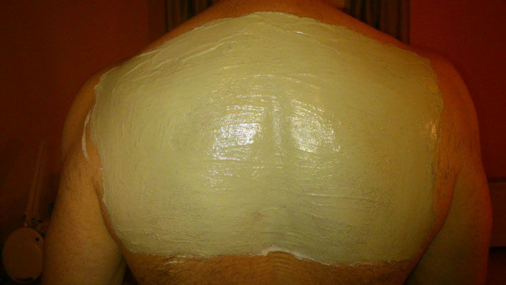 Warme, frisch zubereitete Rückenauflage mit AION A, zum Ausscheiden der gelösten Schlacken durch die Rückenmassage, entspannend, lösend, wärmend, reinigend, nährt und lockert die Muskeln. Eine effiziente Vertiefung und Wirkung der Rücken-massage. Vor- und oder nach der Massage.