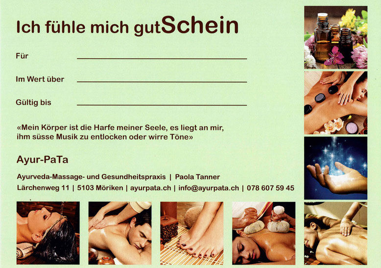 Gutscheine können abgeholt oder nach Zahlungseingang gerne per Post (zuzüglich CHF 2.50.- für Porto und Verpackung) oder Email zugestellt werden.